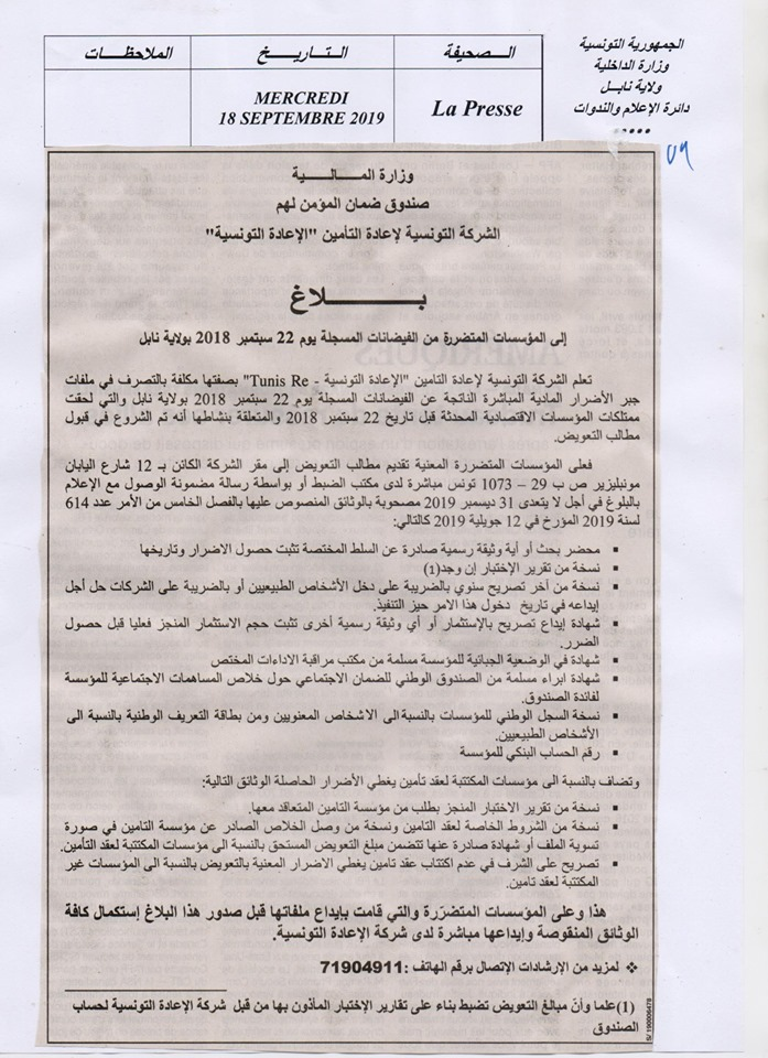 بلاغ إلى المؤسسات المتضررة من الفياضانات المسجلة يوم 22 سبتمبر 2018 الصادر بجريدة La Presse بتاريخ 18 سبتمبر 2019 مرفوق بقائمة المهنيين المتضررين بمعتمدية نابل