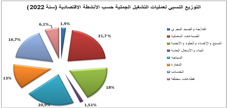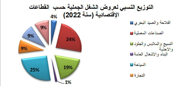 وتتأتى عروض الشغل لسنة  2022 أساسا من القطاعات التالية:  قطاع السياحة بـ 1421 عرض وقطاع الصناعات المعملية بـ1355عرض وقطاع النسيج والملابس والجلود والأحذية بـ 1037 عرض وقطاعات مختلفة بـ521 عرض وقطاع الخدمات بـ 511 عرض فقطاع التجارة  بـ483 عرض وقطاع الفلاحة بـ204 عرض وقطاع البناء والأشغال العامة بـ 74 عرض