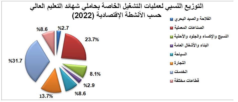 ويحتل قطاع الخدمات المرتبة الأولى من حيث عمليات التشغيل الخاصة بخريجي التعليم العالي 423 عملية تشغيل   يليه قطاع الصناعات المعملية بـ316 عملية تشغيل ثم قطاع التجارة بـ183 عملية تشغيل وقطاعات مختلفة بـ115عملية تشغيل فقطاع السياحة بـ114 عملية تشغيل وقطاع النسيج والجلود والأحذية بـ108 عملية تشغيل أما القطاعات الأقل تشغيلا للإطارات نجد قطاع البناء والأشغال العامة  بـ38 عملية تشغيل  وقطاع الفلاحة والصيد البحري بـ36 عملية تشغيل